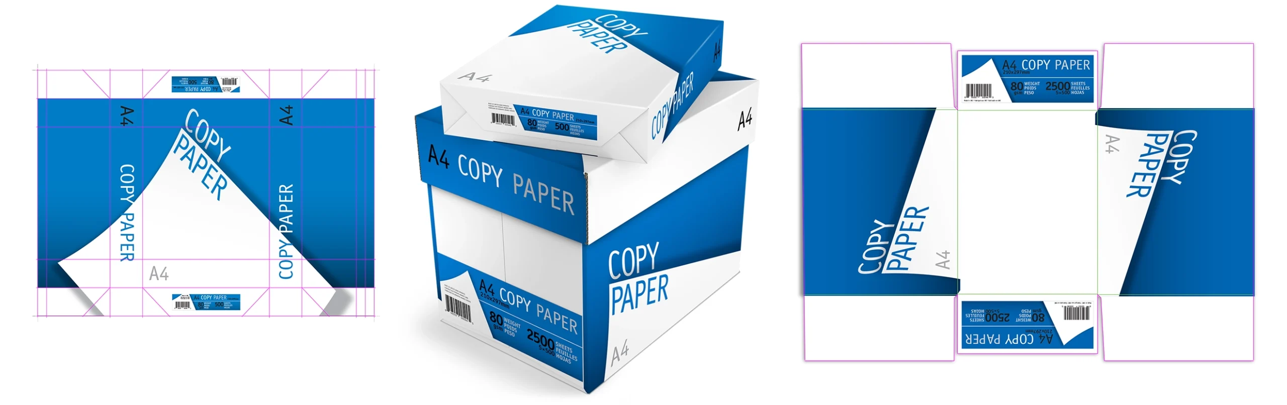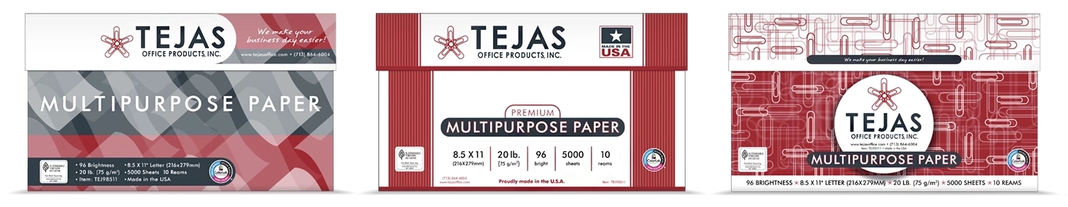 A simple geometric white shape was laid against a contrasting color background for immediate recognition, while curves to the shape, perspective to type, and shadow tones were added for dimension to signify sophistication, presenting a quality product that will operate in machines reliably without failure. Build die-lines per vendor specifications. Two color limit for reduced production costs (black with a second color signifying paper thickness.) Deploy graphics across three products and two sizes, meeting U.S. and European labeling standards. Create 3D models to produce renderings as marketing assets.