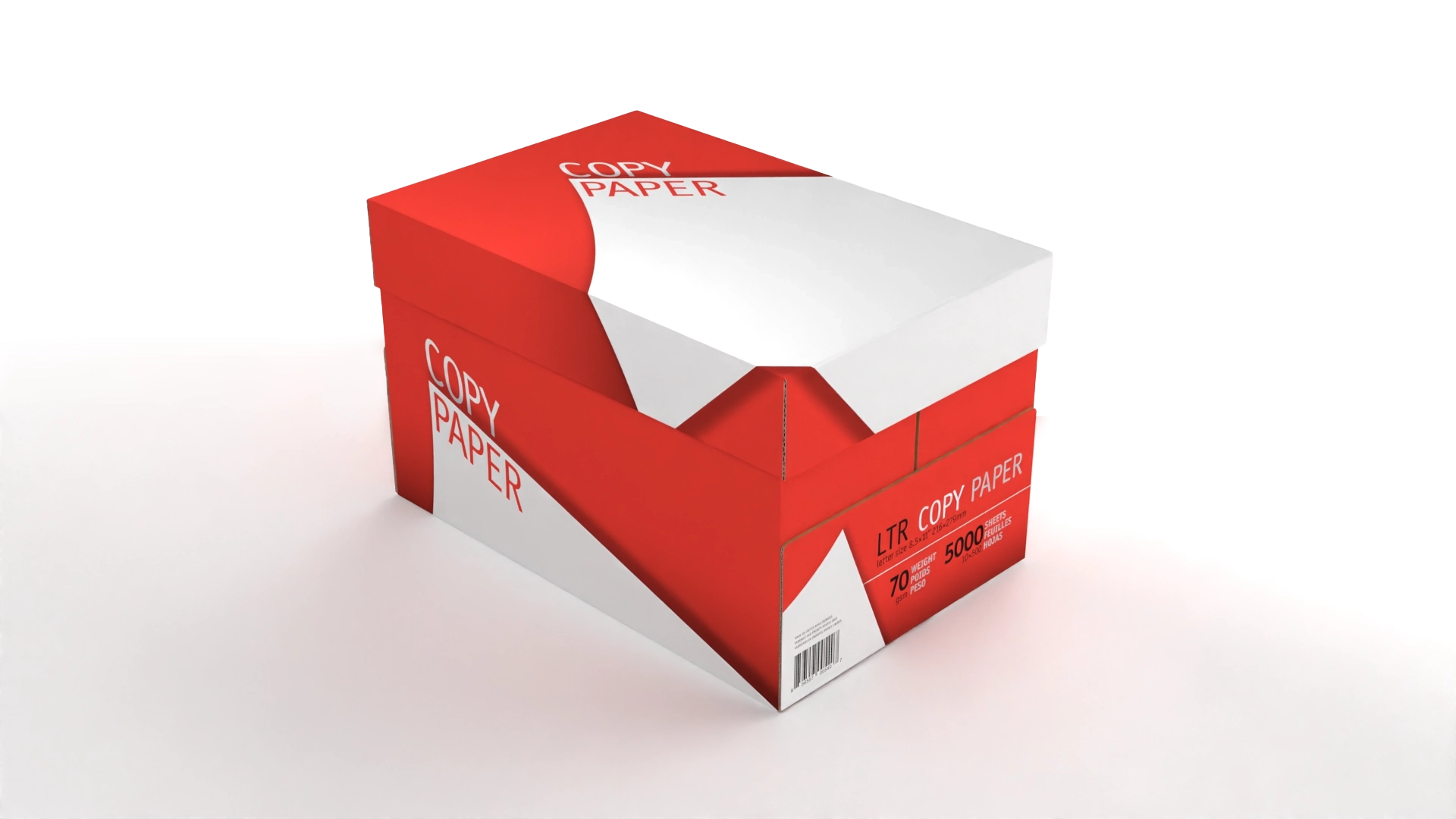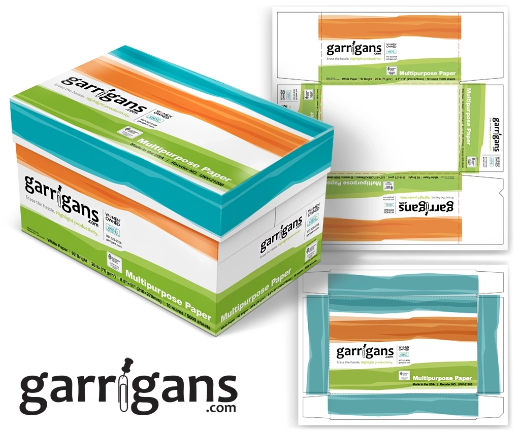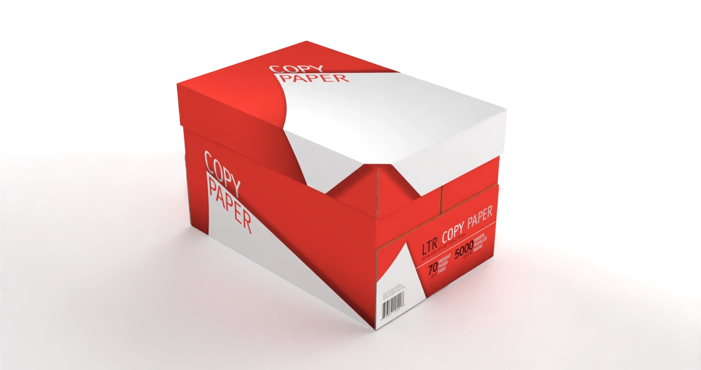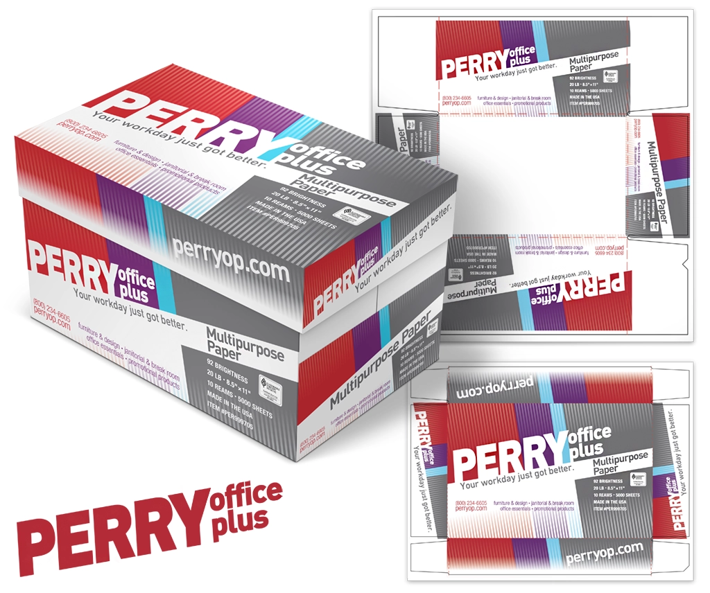 A simple geometric white shape was laid against a contrasting color background for immediate recognition, while curves to the shape, perspective to type, and shadow tones were added for dimension to signify sophistication, presenting a quality product that will operate in machines reliably without failure. Build die-lines per vendor specifications. Two color limit for reduced production costs (black with a second color signifying paper thickness.) Deploy graphics across three products and two sizes, meeting U.S. and European labeling standards. Create 3D models to produce renderings as marketing assets.